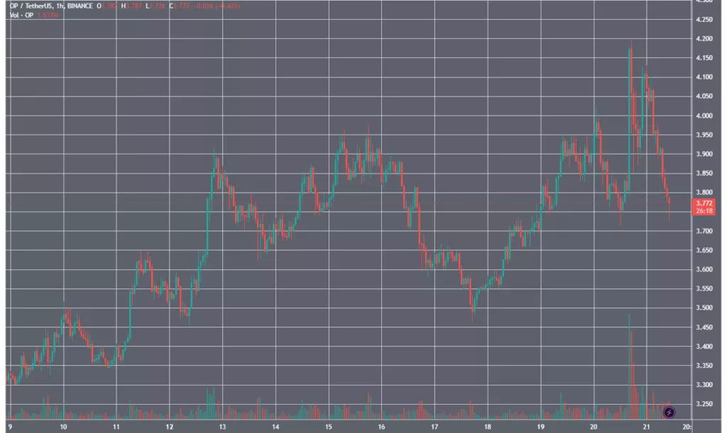 За последние сутки цена OP опустилась почти на 2%. На момент написания актив торгуется на отметке $3,76. Котировки находятся на уровнях примерно на 10% ниже исторического максимума, зафиксированного в январе (CoinGecko).