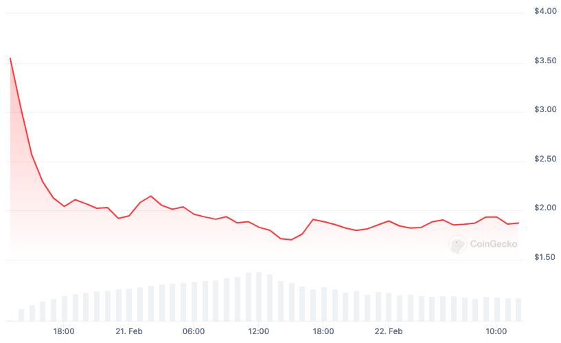 По данным CoinGecko, цена Starknet (STRK) упала почти на 60% и торгуется ниже $1,90 с максимума в $4,41 по состоянию на 20 февраля, когда токен стал доступен некоторым пользователям блокчейна.