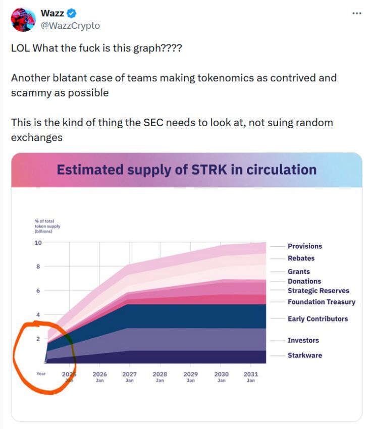 «График разблокировки Starknet больше похож на то, как разработчики платили бы себе за честный запуск DeFi-шиткоина», — написал один из пользователей в Х (бывш. «Твиттер»).