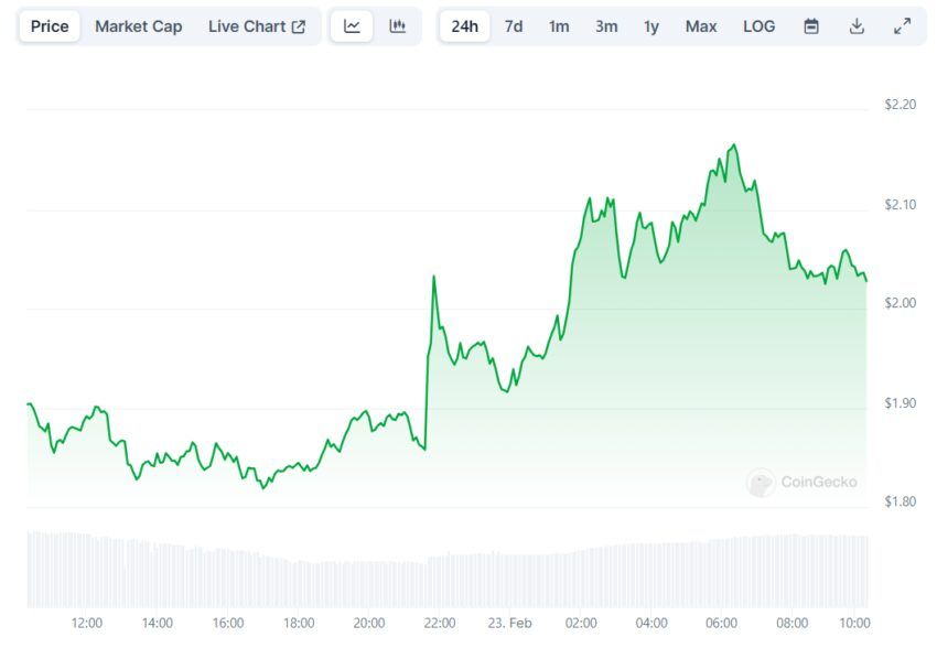 По данным CoinGecko, на момент написания материала STRK торгуется на отметке в $2,03. За последние сутки цена в совокупности укрепилась на 6,4%. В моменте на новость показатель отреагировал резким ростом на 15%.