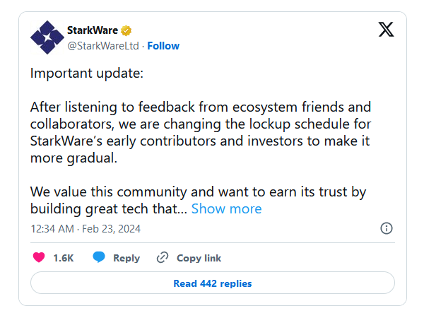 «Постепенная разблокировка будет продолжаться в темпе 0,64% (64 млн токенов) ежемесячно до 15 марта 2025 года, после чего она изменится на 1,27% (127 млн) ежемесячно в течение следующих 24 месяцев до 15 марта 2027 года», — говорится в сообщении StarkWare.