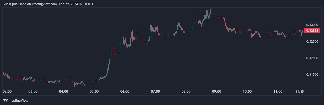На момент написания актив торгуется по $0,1282, согласно TradingView. За сутки, с 28 по 29 февраля 2024 года, прирост составляет 10%, за неделю — 51%.