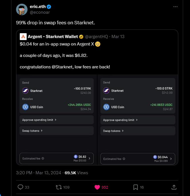 Starknet (STRK) и другие важные ролапы Ethereum стремились ускорить свою способность направлять доказательства в пространство больших двоичных объектов после внедрения Dencun. Сеть была одной из первых, кто включил функцию blob в тот же день, когда состоялся хардфорк, а сообщения о значительном снижении комиссий пользователей последовали несколько часов спустя.