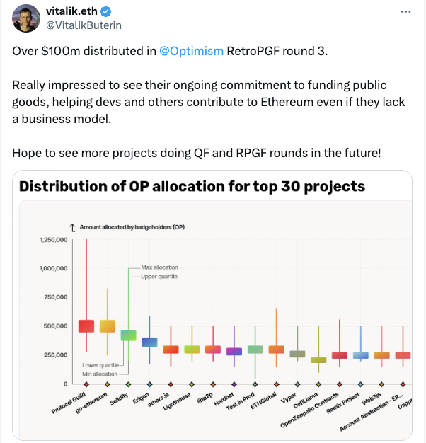 Соучредитель Ethereum Виталик Бутерин заявил в посте X после раунда, что он был «действительно впечатлен» приверженностью Optimism финансированию общественных благ.