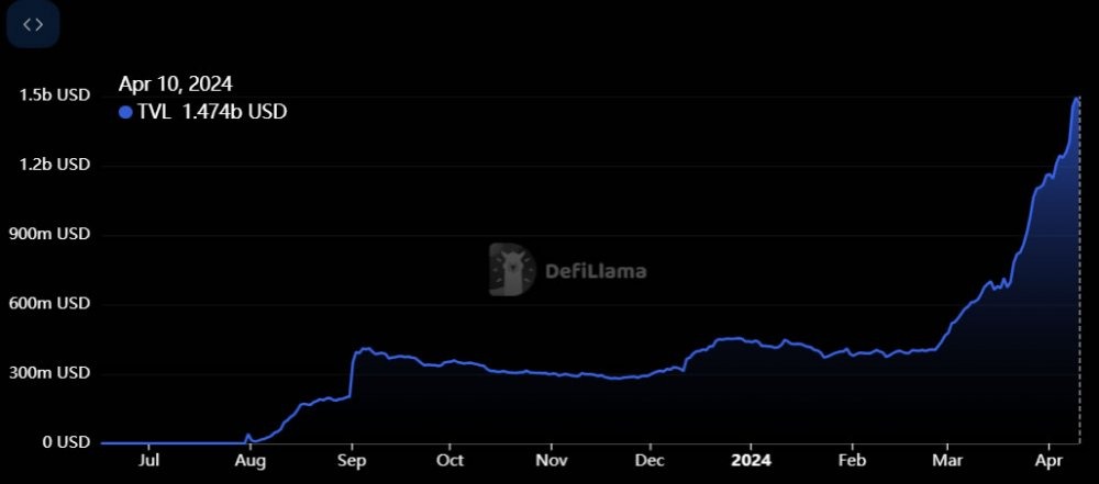 По данным DefiLlama, общая заблокированная стоимость (TVL) в сети Base выросла до рекордного уровня в 1,5 миллиарда долларов 9 апреля. Это представляет собой увеличение на 235% с начала этого года, поскольку в сеть хлынули фанаты мемкоинов.