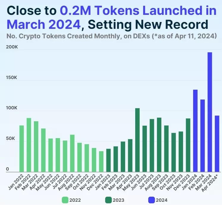 Темпы появления новых монет ускорились в 2024 году. По состоянию на 11 апреля было создано уже 0,54 млн токенов, что означает запуск в среднем 5300 криптоактивов в сутки.
