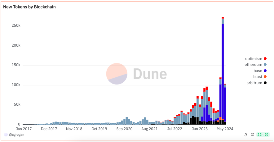 С 1 апреля в сети Ethereum появилось 372 642 токена, из которых 88% запущено на базе L2-решения Base. Такая активность, вероятно, вызвана дешевыми транзакциями и ажиотажем вокруг мем-токенов.