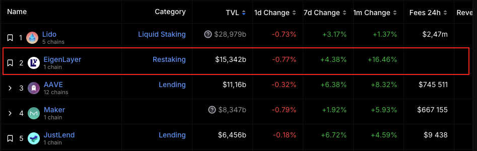По данным DeFi Llama, TVL появившегося в январе EigenLayer уже в апреле приблизился к $16 млрд. На момент написания показатель скорректировался к $15,3 млрд.