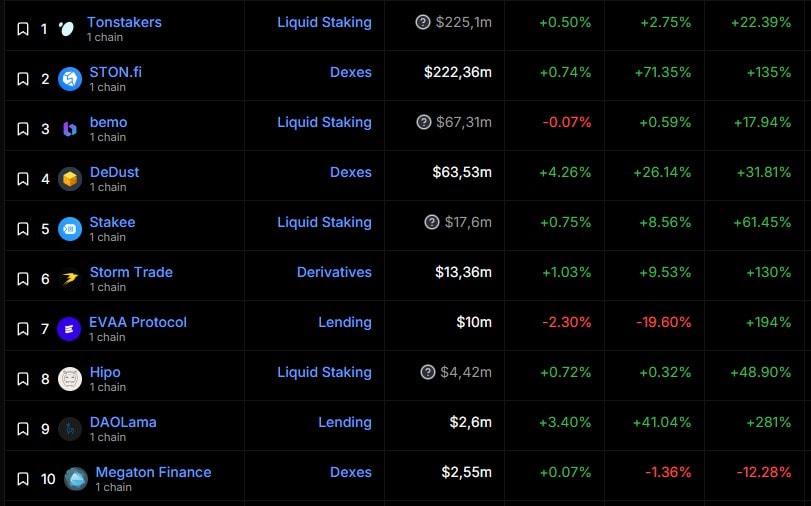 Среди проектов на базе TON лидерами по TVL является протокол ликвидного стейкинга Tonstakers и децентрализованная биржа STON.fi. Совокупная стоимость заблокированных активов в этих проектах составляет $225,1 и $222,3 млн соответственно.