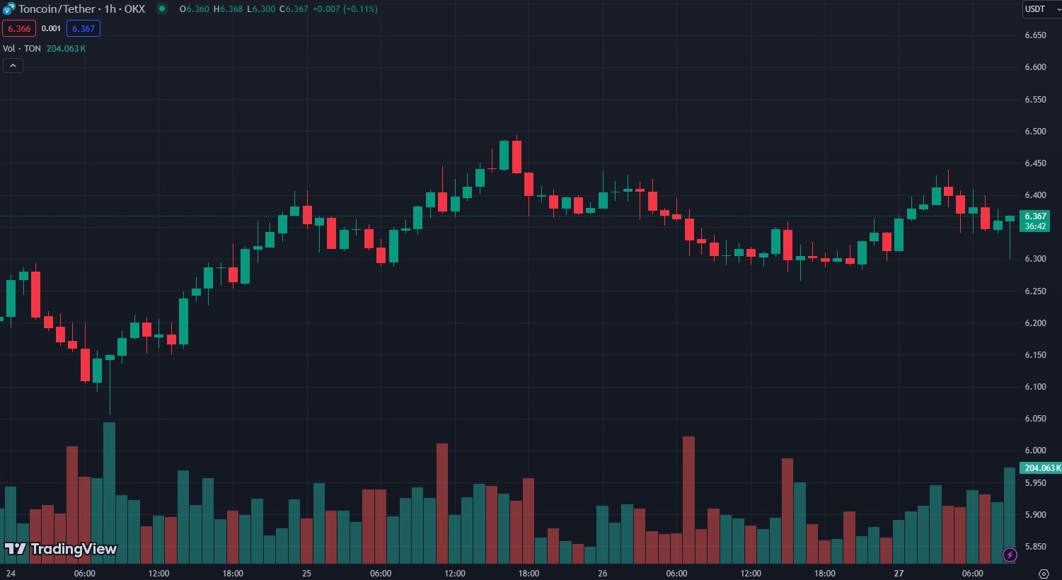 Курс токена TON за последние сутки не показал значительных изменений. Актив торгуется выше $6,35 на момент написания, по данным TradingView. 11 апреля 2024 года цена TON установила исторический максимум на отметке $7,63.