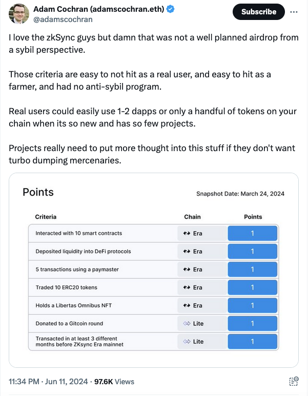 «Аирдроп zkSync закончился. Вероятно, это самый пригодный для фарминга и эксплуатации аирдроп», — написал Мудит Гупта, руководитель информационной безопасности конкурирующей сети второго уровня Polygon, в сообщении X от 11 июня.