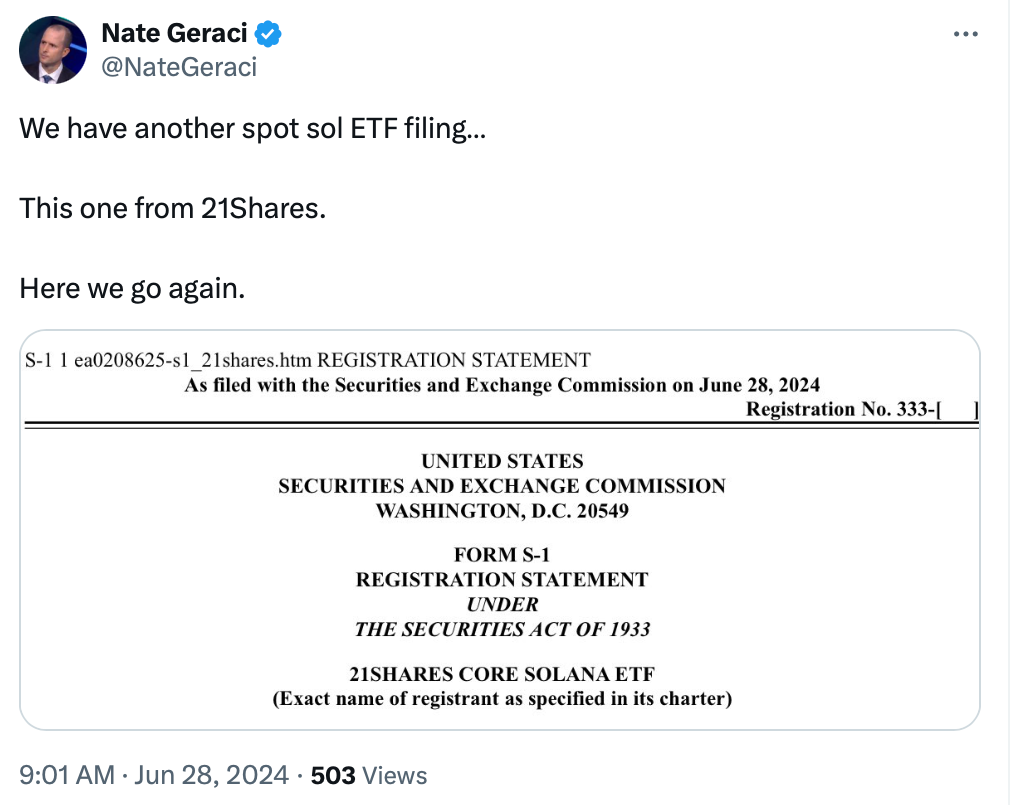 21Shares подала заявку S-1 в Комиссию по ценным бумагам и биржам США на создание спотового биржевого фонда Solana (ETF) 28 июня. Фонд будет называться 21Shares Core Solana ETF. Это вторая заявка, полученная SEC на спотовый Solana ETF, после подачи аналогичной заявки VanEck 27 июня.