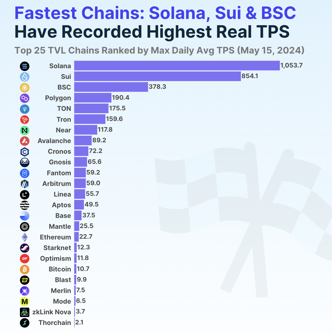 Solana считается одним из самых быстрых блокчейнов в индустрии. В рейтинге агрегатора данных CoinGecko сеть занимает первое место. В апреле фактическая среднесуточная скорость транзакций в секунду (TPS) достигла рекордной отметки в 1 504.