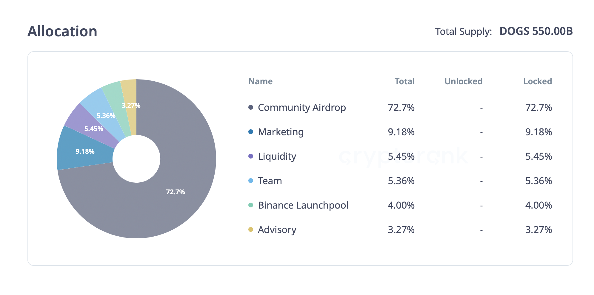 Согласно токеномике DOGS, общее предложение актива составит 550 млрд монет. Сообществу команда проекта выделила 81,5%, из которых 73% предназначены для «олдов» мессенджера. Оставшуюся часть распределят между трейдерами и будущими членами сообщества.