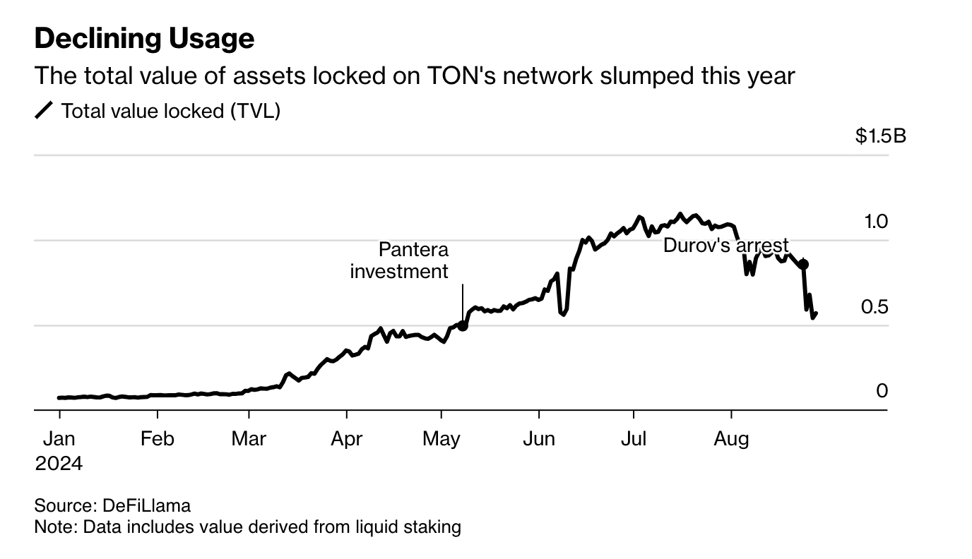 С начала года стоимость TON выросла в четыре раза, а общая стоимость заблокированных активов (TVL) сети взлетела на несколько тысяч процентов. Однако после ареста Павла Дурова показатели резко просели.