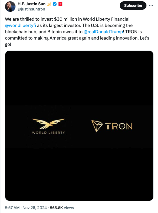 «Мы очень рады инвестировать $30 млн в World Liberty Financial в качестве крупнейшего инвестора», — написал Сан в сообщении X от 25 ноября. «TRON стремится снова сделать Америку великой и стать лидером инноваций».