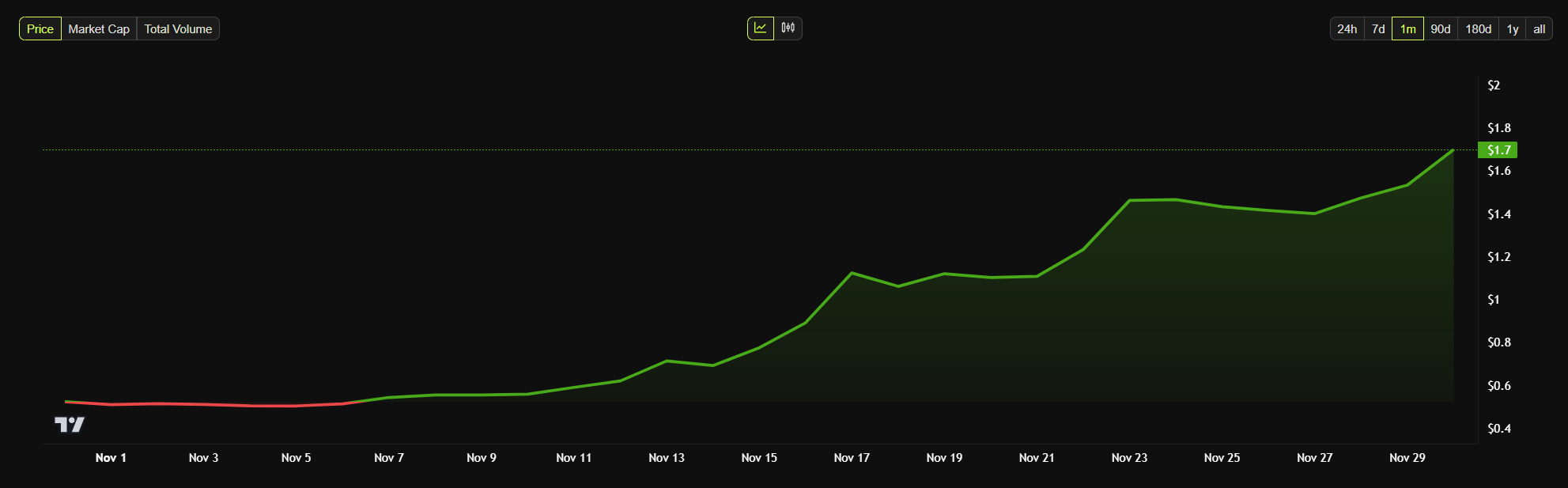 Нативный токен Ripple XRP недавно обогнал BNB и стал пятой по величине криптовалютой по капитализации. Цена XRP выросла более чем на 230% в ноябре благодаря доверию инвесторов и продолжающемуся бычьему импульсу на рынке.