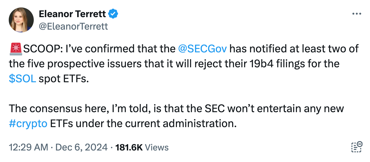 По словам репортера Fox News Элеанор Терретт, агентство уведомило об этом по крайней мере двух из пяти эмитентов, желающих получить одобрение на ETF Solana.