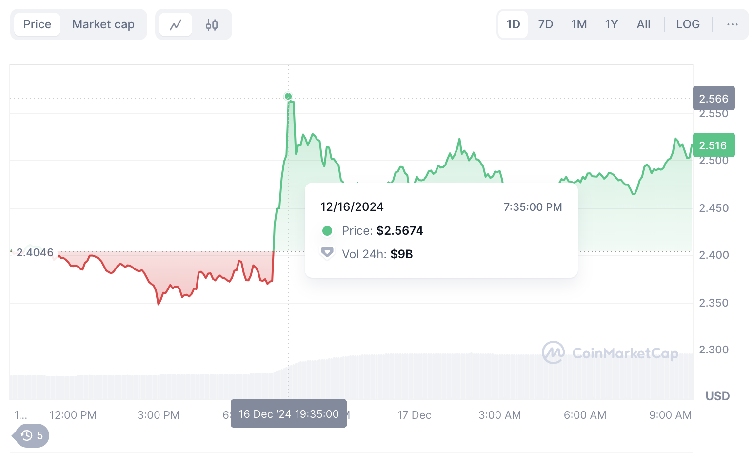 Компания Ripple объявила о запуске собственного стейблкоина RLUSD 17 декабря 2024 года. После анонса курс XRP вырос на 10% и протестировал отметку $2,56