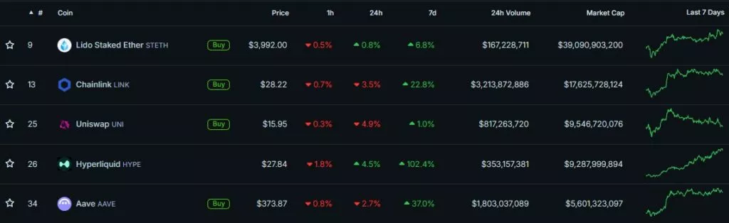 Капитализация монеты достигла ~$9,3 млрд — по этому показателю HYPE занимает четвертое место в DeFi-сегменте.