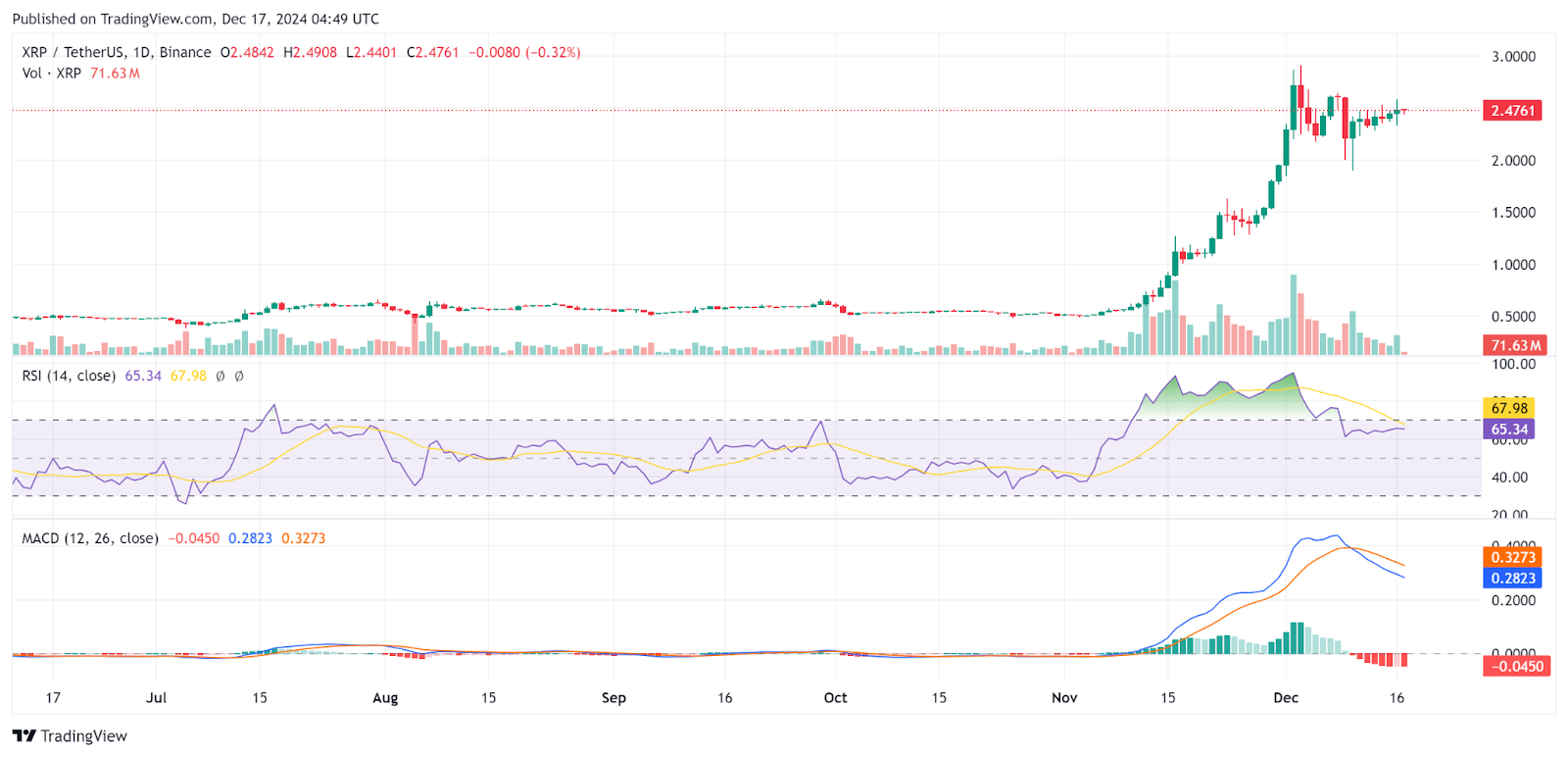 На момент написания статьи XRP торгуется по $2,47 с рыночной капитализацией $141,2 млрд и занимает третье место среди криптовалют по оценке. Интересно, что индекс относительной силы для ценового действия XRP показывает значение 65,34, что означает, что быки в целом контролируют ценовое действие альткоина, а градиент линии предполагает движение к $2,5.