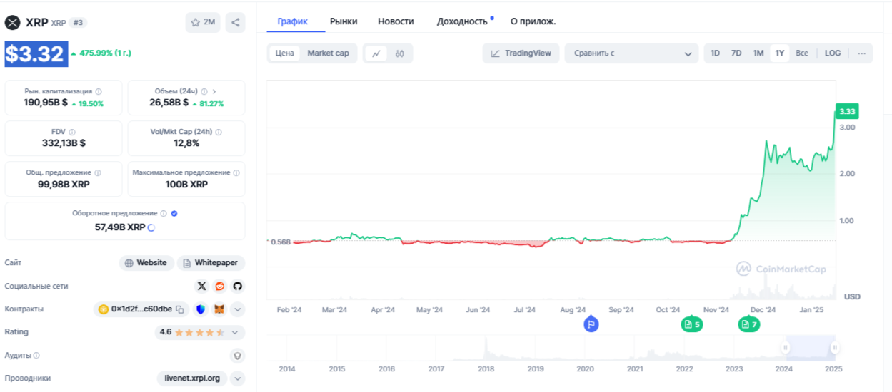 XRP только что достиг новых рекордных максимумов на различных спотовых криптовалютных биржах. И в настоящий момент торгуется за 3,32 $ за монету.