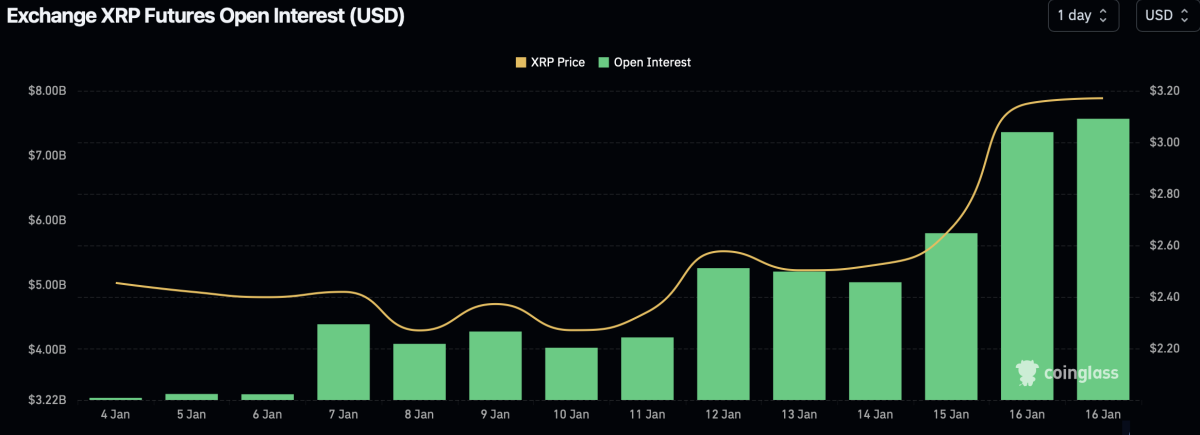 Открытый интерес к фьючерсам XRP на основных биржах криптовалютных деривативов достиг рекордного уровня. Изображение: Coinglass.
