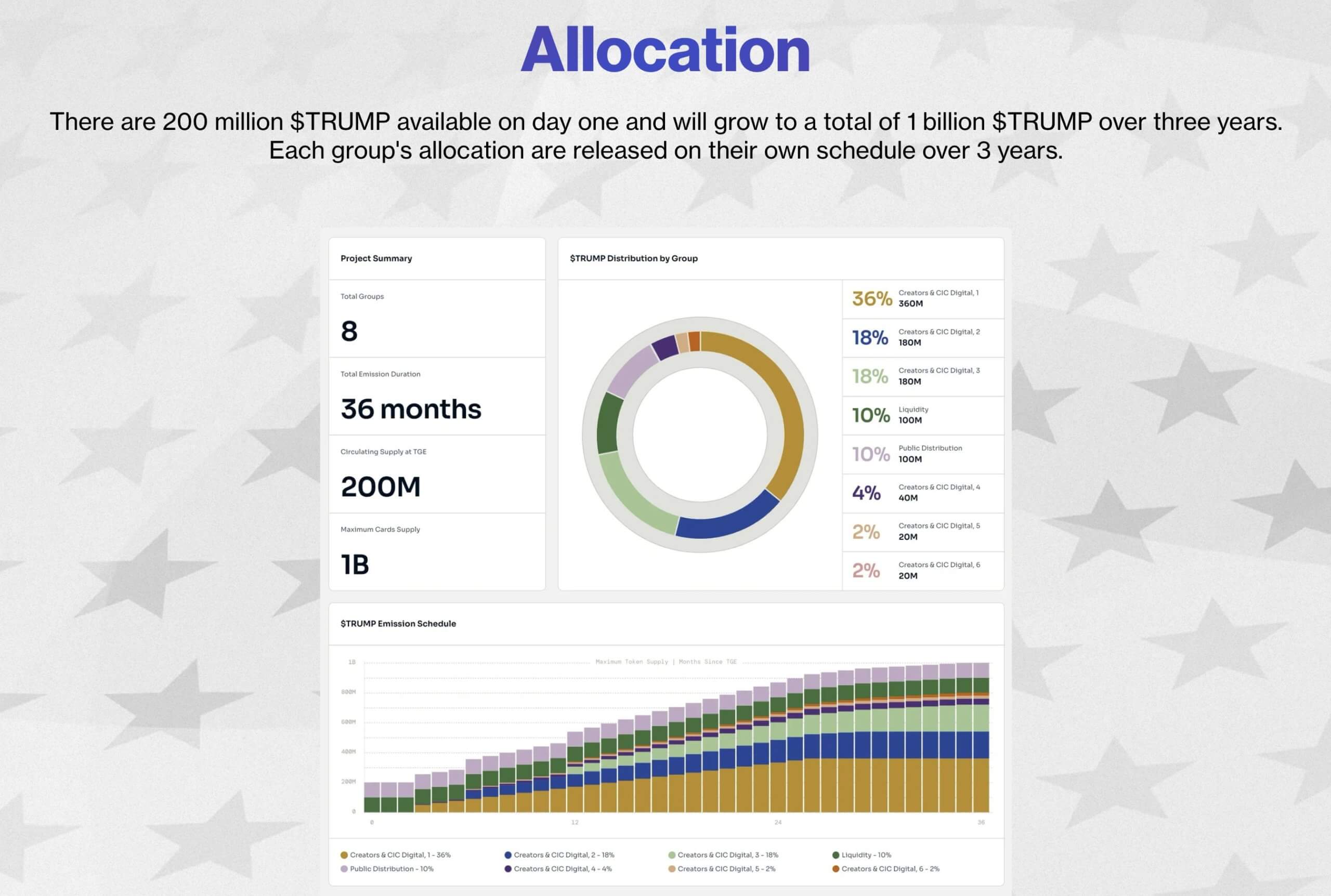 Максимальное предложение токена TRUMP составляет миллиард монет. Сейчас в обращении находятся 200 миллионов токенов, причём до миллиарда показатель увеличится за три года. 80 процентов от общего предложения находится на одном адресе.