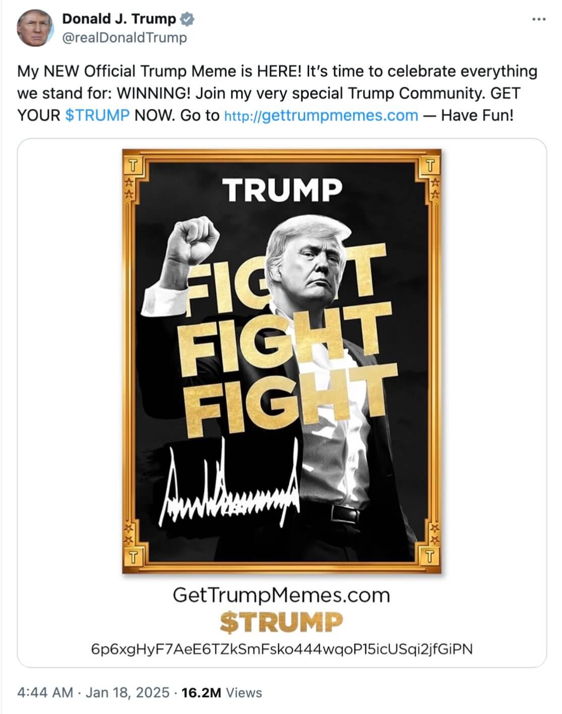 Сегодня утром внутри учётных записей Трампа в социальных сетях Truth Social и X появилась реклама мем-токена, которого автор записи назвал «официальным Трамп-мемом». В Твиттере публикация набрала более 16 миллионов просмотров, то есть внимание к происходящему оказалось огромным. Вот как выглядит твит.