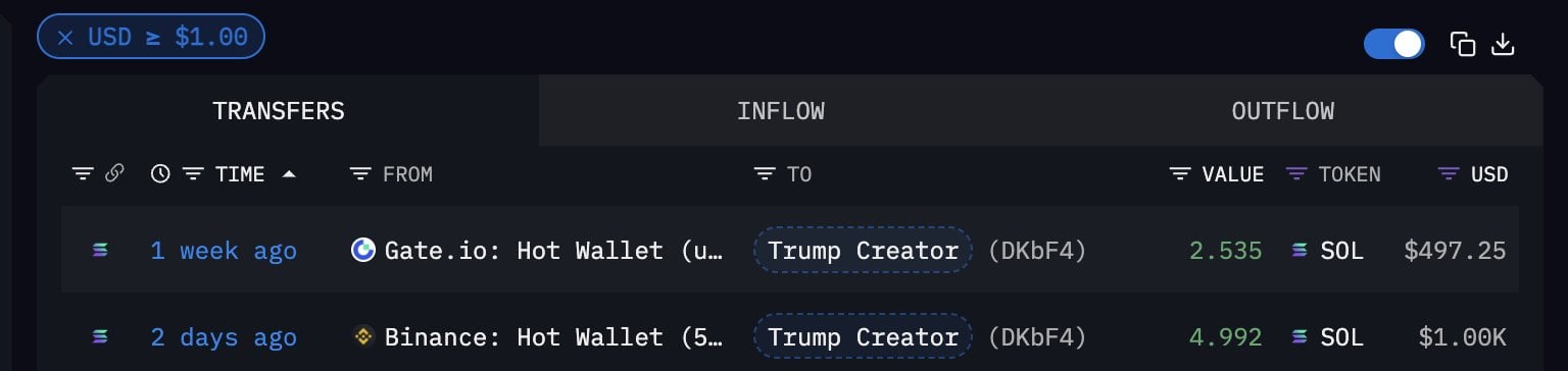 Пополнение криптовалютой адреса, который запустил мем-токен Трампа