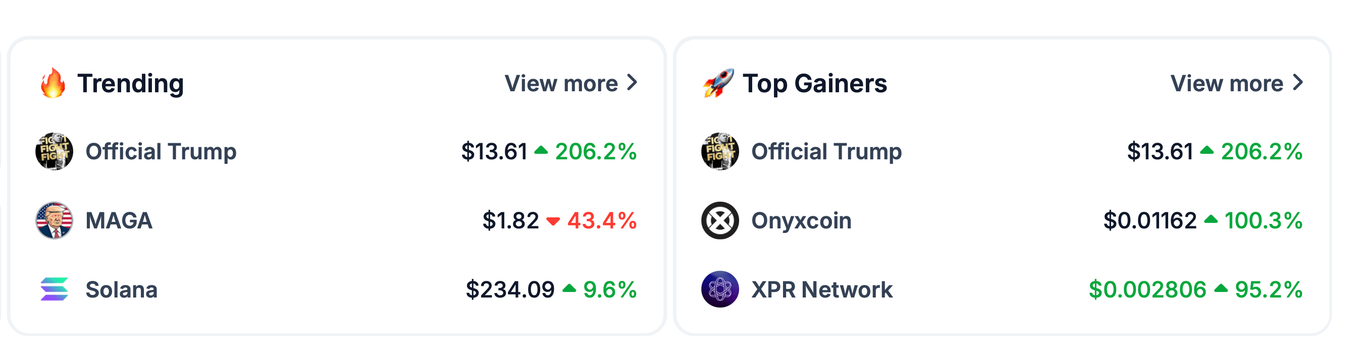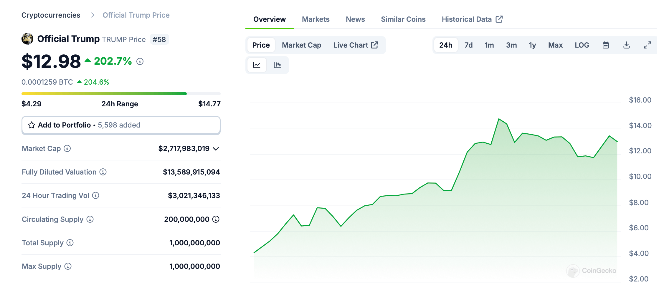Курс токена Official Trump превышает 13 долларов. В итоге криптовалюта оказалась самой трендовой и доходной на платформе Coingecko.