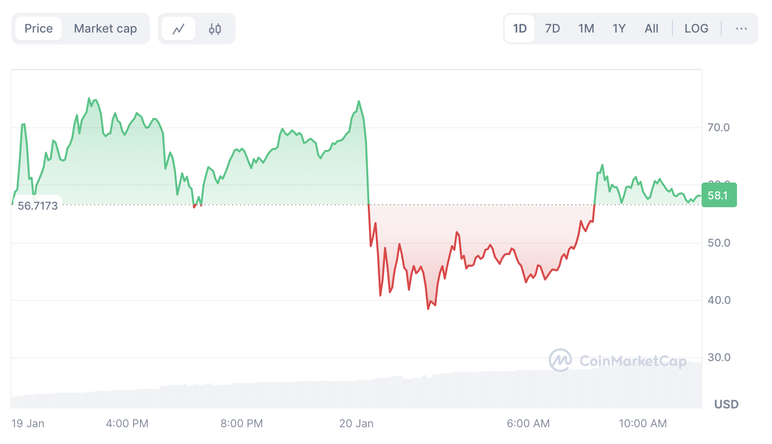 «Мемная» монета привлекла внимание трейдеров сразу после запуска. За считанные часы ее капитализация взлетела до $13 млрд. Цена на пике составляла $75.