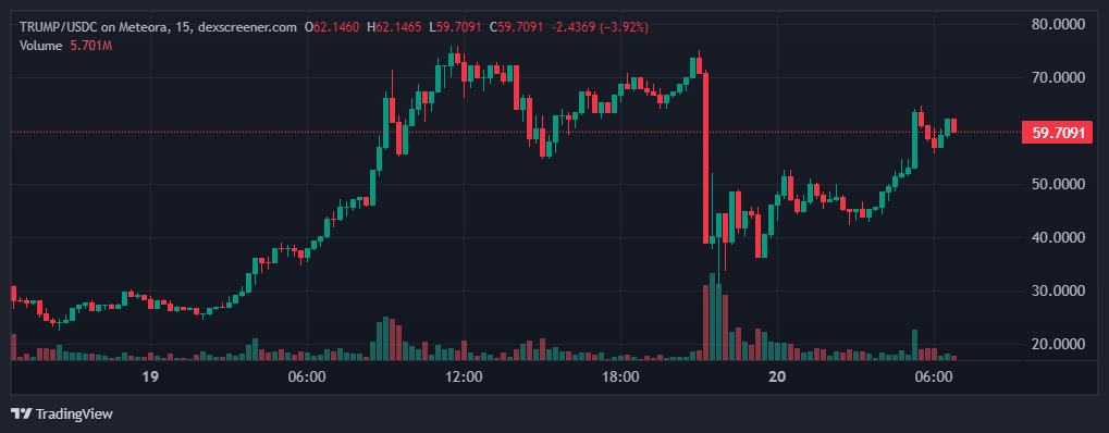 Цена мем-коина TRUMP частично восстановилась и находится на уровне $59,7.