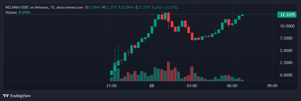 На момент написания MELANIA торгуется на отметке $12,21 с FDV свыше $12 млрд. Актив занимает 77 место в рейтинге CoinGecko.