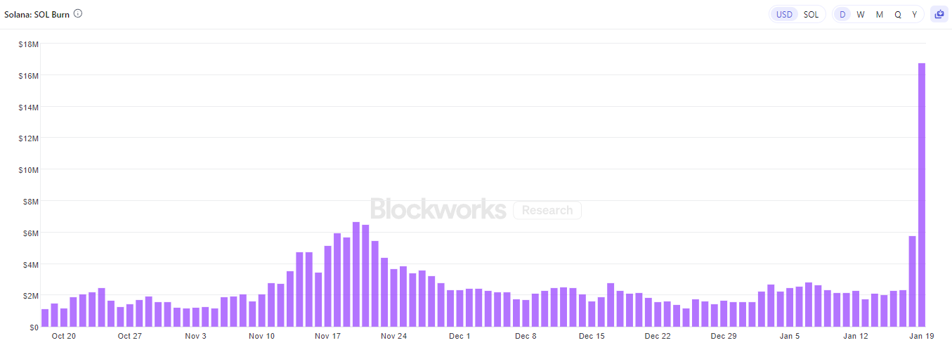 19 января стоимость сожженных монет SOL достигла рекорда в $16,7 млн — 81% суточной эмиссии.