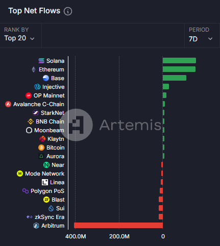 Чистый приток средств в экосистему Solana за неделю составил $153,2 млн. Одновременно оттоки из сети Arbitrum достигли $405 млн.