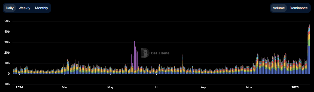 На фоне ажиотажа вокруг мем-коинов семьи Трампов по состоянию на 19 января объем торгов DEX на блокчейне Solana достиг рекордных $26,8 млрд против показателя Ethereum в $5 млрд.