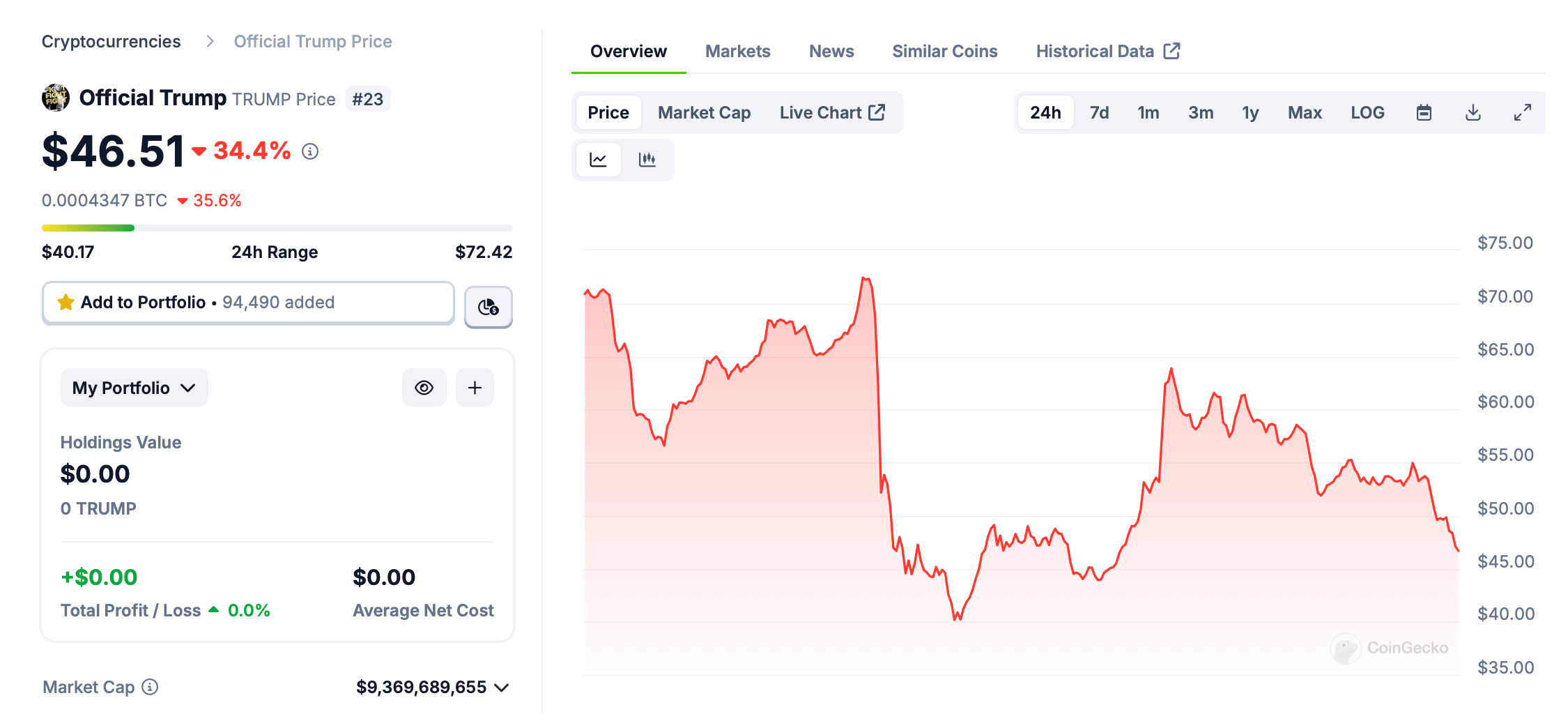За последние сутки мем-токен TRUMP обвалился на 34 процента, на фоне чего его рыночная капитализация сократилась с 14 до 9.3 миллиарда долларов. Актуальный курс монеты отстаёт от максимума на 37 процентов.