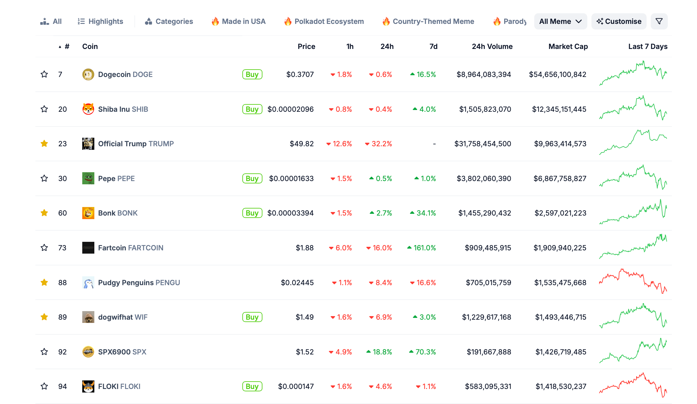 Ситуация с курсами крупнейших мем-токенов по рыночной капитализации