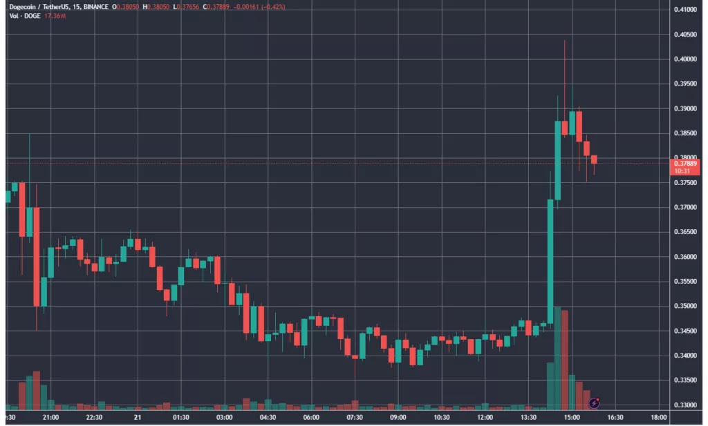 На этом фоне котировки цифрового актива в моменте взлетели в район $0,4. После незначительной коррекции курс откатился к ~$0,38.