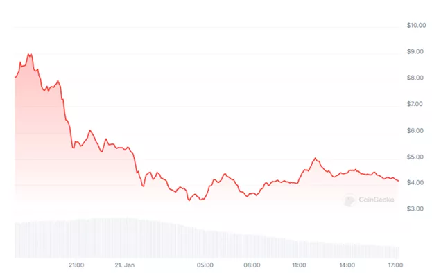 21 января падение цен токенов Official Trump (TRUMP) и Melania Meme (MELANIA) от пика достигло 29,8% и 53,8% соответственно. К резкой фиксации прибыли привело отсутствие упоминания криптовалют во время выступления Дональда Трампа на инаугурации.