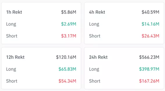 По данным Coinglass, за последние 24 часа ликвидации подверглись 217 538 позиций трейдеров на $566 млн, из которых $399 млн пришлись на лонги.
