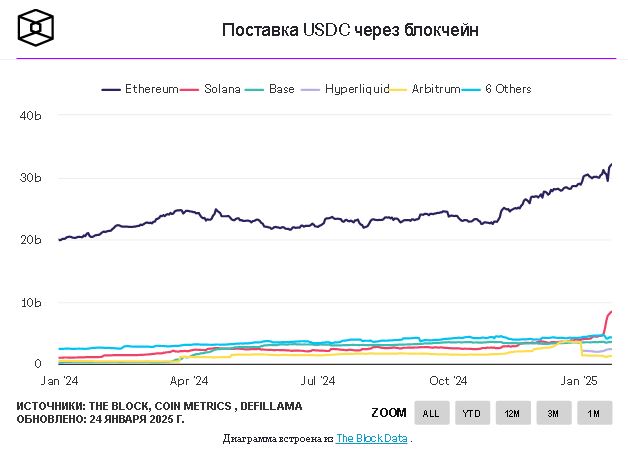Этот всплеск предложения стейблкоинов Solana соответствует более широким тенденциям использования стейблкоинов в протоколах DeFi сети и увеличению объема торговли мемкоинами за последний год, чему также способствовало внедрение в сеть мемкоинов семьи Трампа.