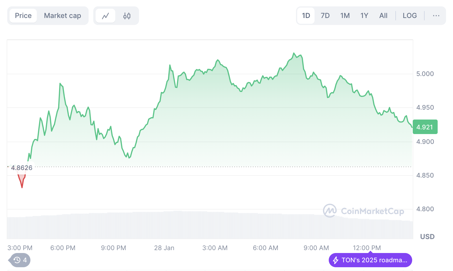 Нативный токен The Open Network — Toncoin — никак не отреагировал на новость о предстоящих обновлениях экосистемы. По данным CoinMarketCap, на момент написания материала TON торгуется по $4,92. За прошедшие сутки цена актива выросла на 1%.