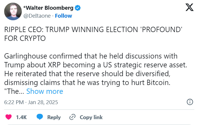 Трамп понимает значение криптовалют для экономики США. Он уже предпринимает шаги, чтобы усилить позиции страны в этом секторе. По словам главы Ripple, после выборов XRP значительно вырос. Он связывает это с тем, что новые власти США стали благосклоннее к криптовалютам.