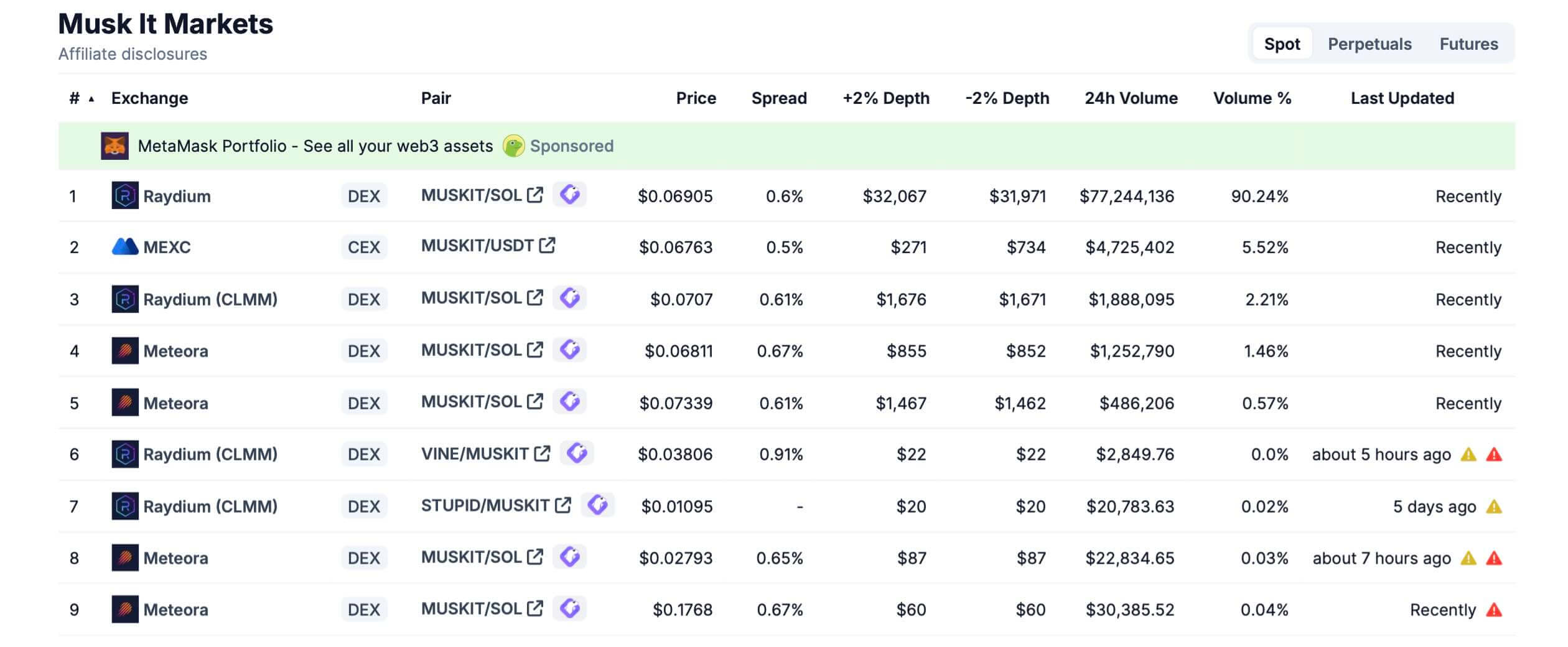 MUSKIT запущен в сети Solana, поэтому торги с ним происходят на популярных платформах в этом блокчейне. В частности, это Raydium и Meteora, ну а среди централизованных платформ монету успела добавить MEXC.