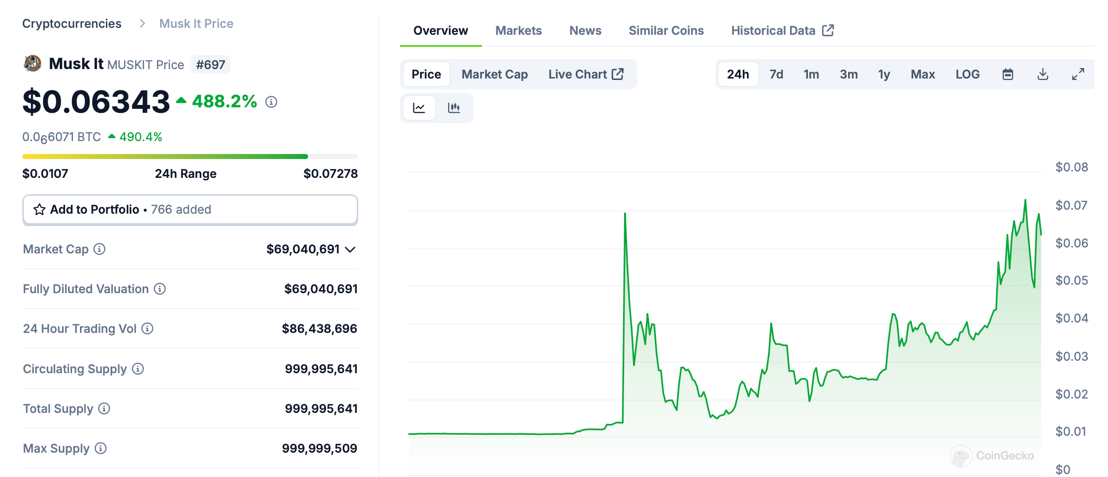 Стоимость мем-токена MUSKIT сегодня составляет 6.3 цента. За последние сутки криптоактив подорожал на 488 процентов, из-за чего его рыночная капитализация составляет 69 миллионов долларов. То есть проект является небольшим.