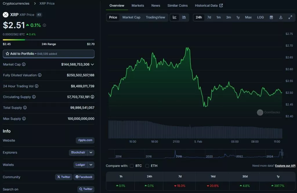 На фоне остановки сети цена токена XRP упала до $2,45. Следом котировки восстановились к отметкам в районе $2,5. В результате курс монеты за последние сутки практически не изменился.