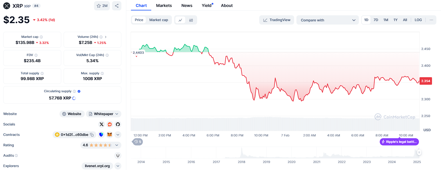 XRP is currently attempting to break past the $2.50 mark after trading between a low of $2.29 and a high of $2.46. The coin dropped to $1.96 on February 3, impacted by broader market negativity and global tariff cuts.