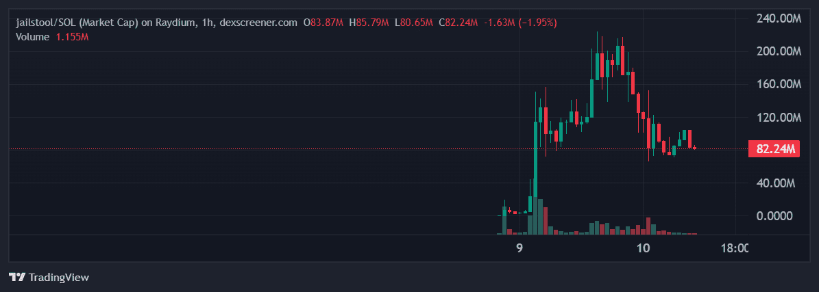 Капитализация мемкоина в моменте пробила $221 млн, после чего откатилась до $82,2 млн на момент написания: